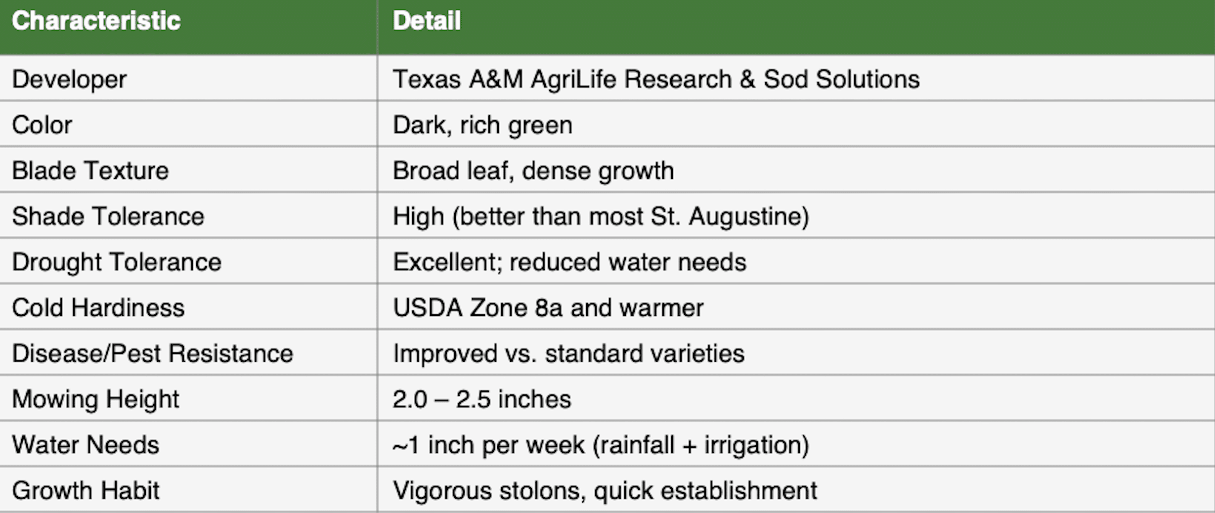 Cobalt™ St. Augustine is the newest generation of St. Augustinegrass, developed through nearly 20 years of research by Texas A&M AgriLife Research in partnership with Sod Solutions. Using advanced breeding techniques, researchers combined the best qualities of parent lines to create a turf that is darker, denser, and more resilient than traditional St. Augustine varieties.